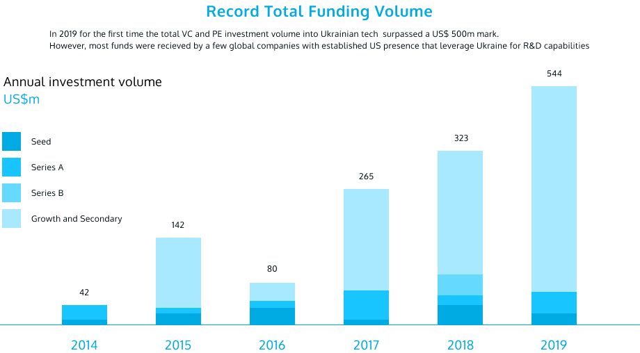 The best confirmation that Ukrainian IT is on the right track is a stable, close to an exponential growth of investments in startups, primarily by venture capital and private equity. While funding volumes are still tiny at the beginning of 2020, the overall trend is positive.